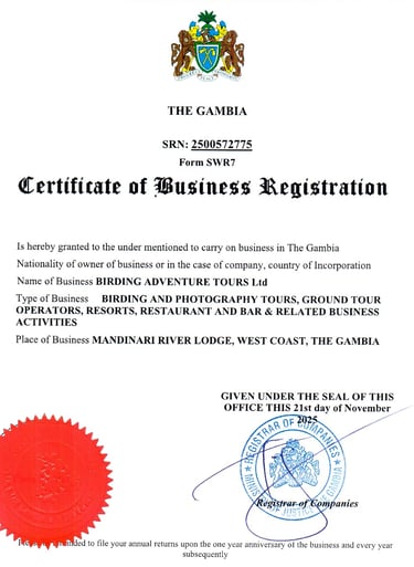 My company, Birding Adventure Tours LTD, is officially registered and accredited by the Gambia Tourism Board and is headquartered at Mandinari River Lodge, West Coast, The Gambia. This enables me to offer every traveller guided by my company a safe and reliable tour experience, fully supported by the Gambia Tourism Board.